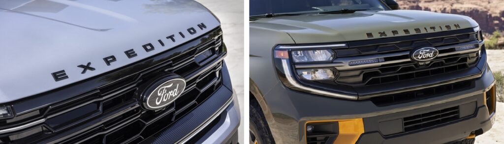 Sus imponentes formas cuadradas no esconden el parecido con las camionetas de Ford, ahora más por un nuevo diseño de faros frontales que le alinean mejor con el resto de la familia de camiones, sin embargo, Ford utiliza algunas líneas de carácter selectas en la carrocería y pilares en negro detrás del parabrisas para reducir parte de ese peso visual y así aligerando su apariencia si la comparamos con la agresividad algo exagerada de modelos competidores de Chevrolet.