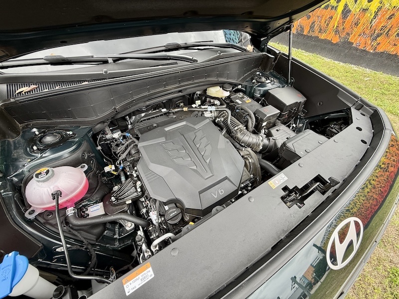 El corazón mecánico es un V6 atmosférico de 3.8 litros, acoplado a una transmisión automática de 8 velocidades y al sistema HTRAC AWD de Hyundai. Este conjunto prioriza suavidad, fiabilidad y capacidad de respuesta progresiva antes que cifras extremas, algo coherente con su enfoque. La potencia es más que suficiente para mover con solvencia un SUV grande, cargado de pasajeros y equipaje, incluso en carretera o condiciones adversas.